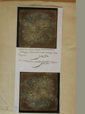 Hawy Rahman "krieg + friedens= verzweifilung" photocopy und gold |