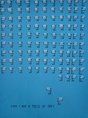 Michaela Kirchknopf "Skyshopping No.1" Acryl/Tinte auf Karton Shopper: Can I buy a piece of sky? Trader: The blue or the dark one? Shopper: The cheap one! |